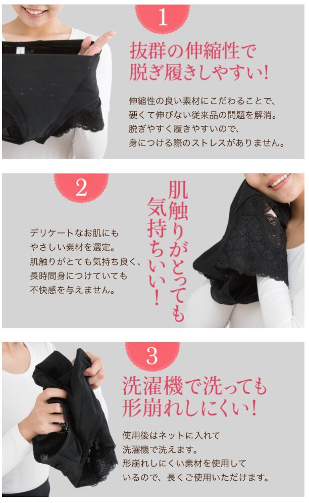緻密に計算された設計パターン(特許取得)が、骨盤の歪みや緩みをキュッと引き締め。崩れたヒップラインを修復しキープします。さらに、中心パネルで丸く美しいヒップラインをつくりあげます。骨盤の歪みが整うことで、血液循環や代謝がアップし、女性特有の不調の軽減が期待できます。